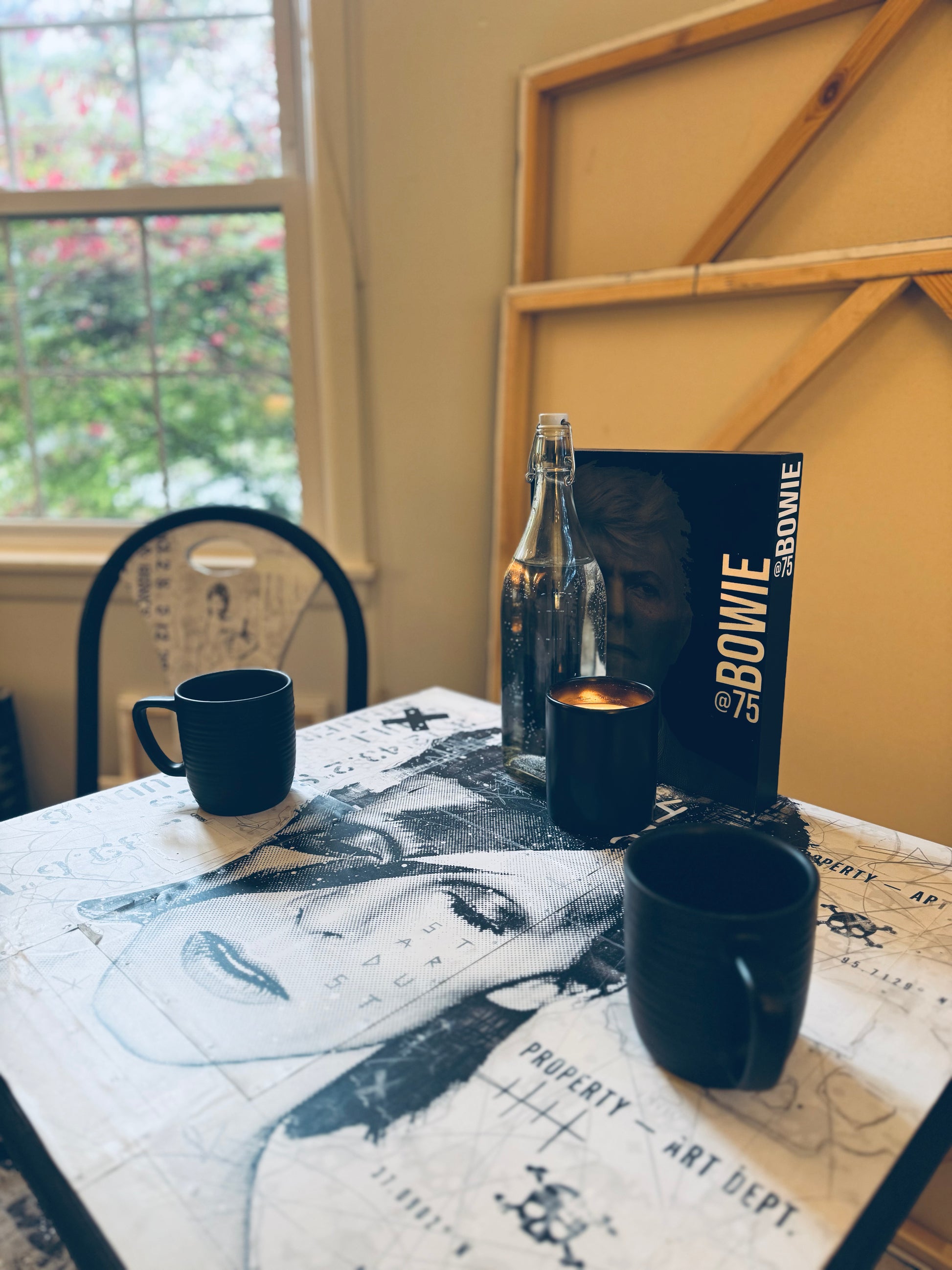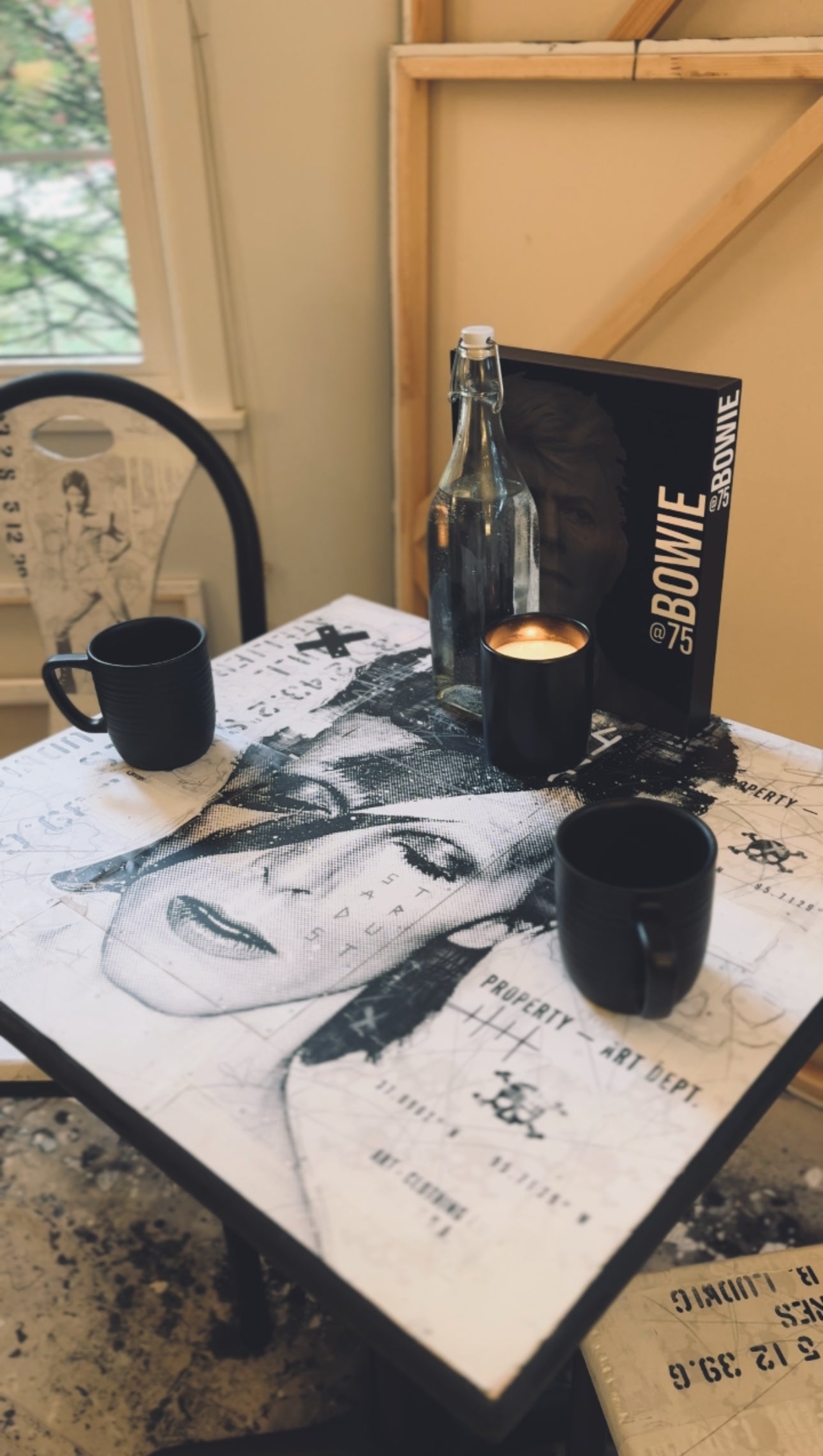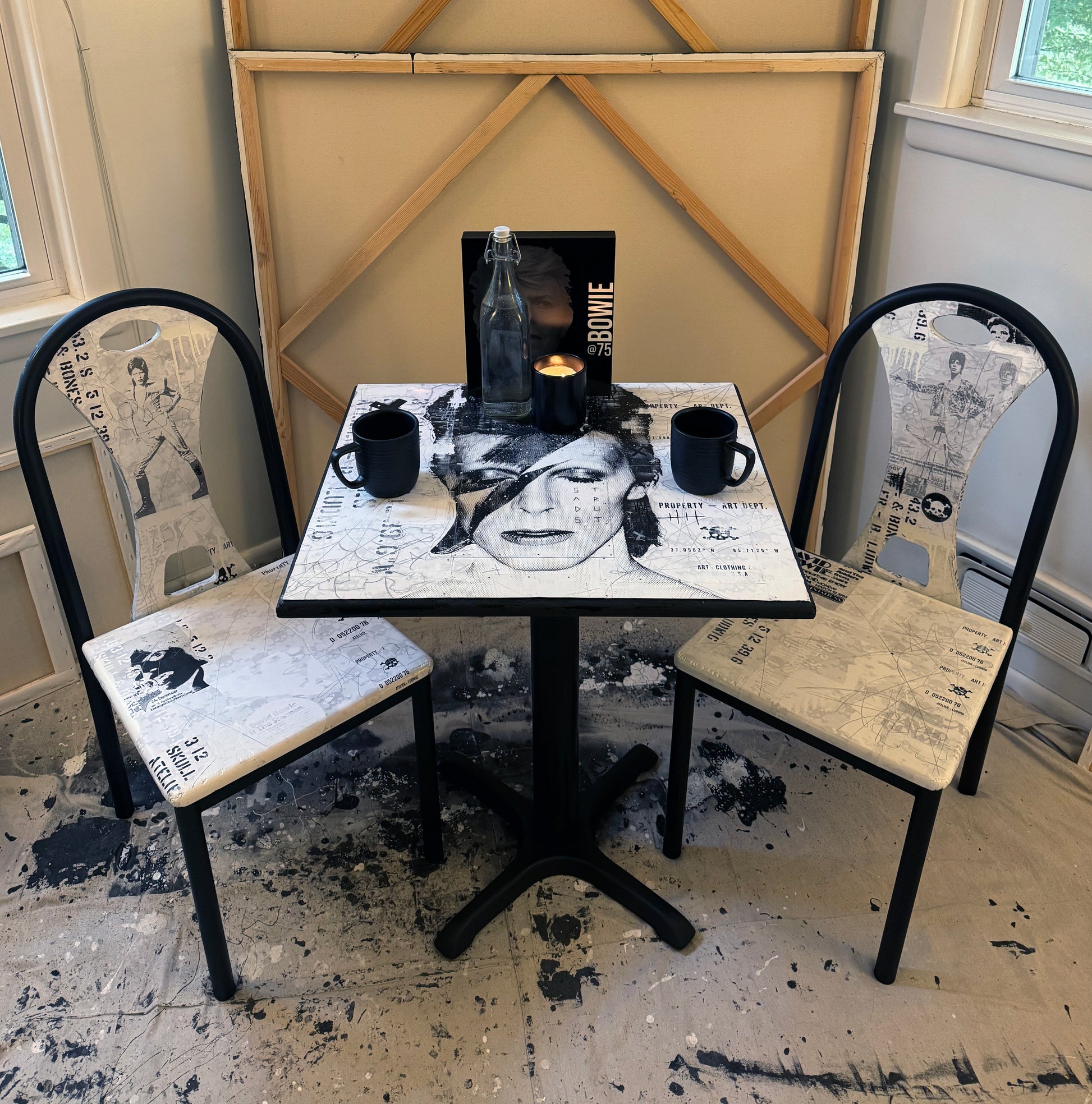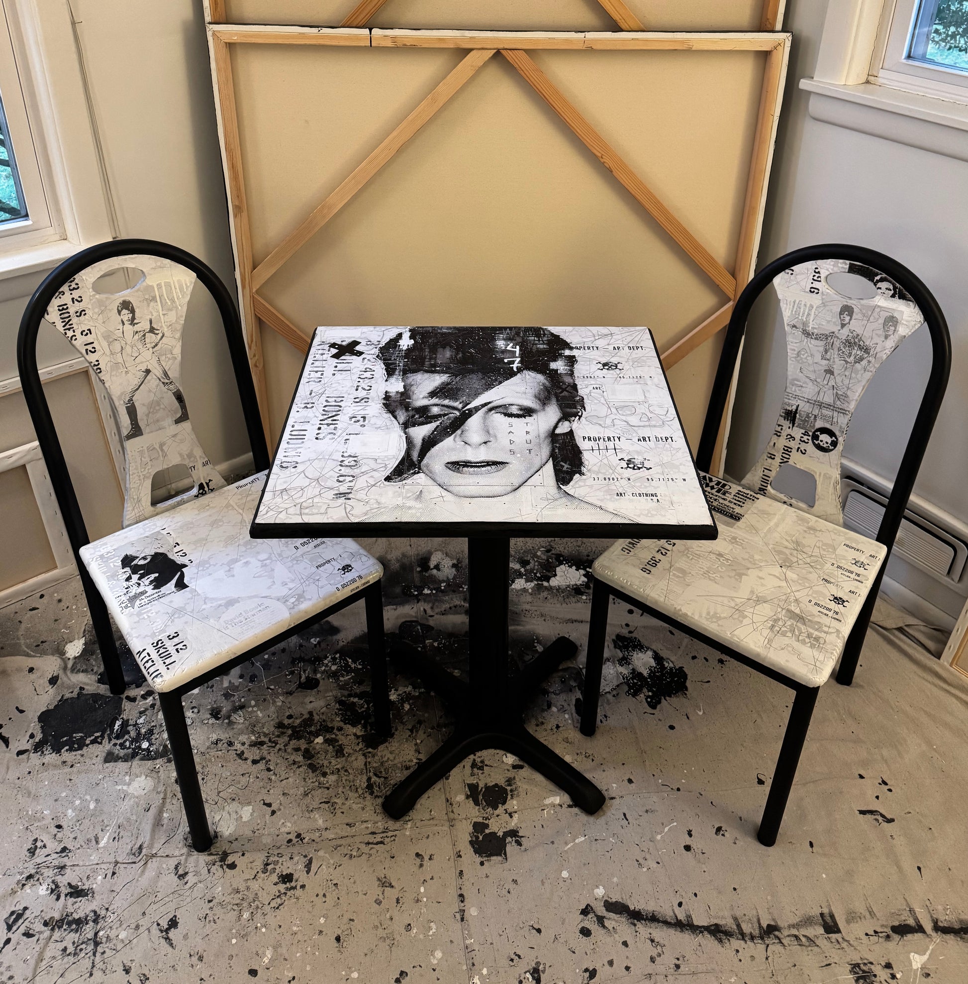 This is the FIRST one of a kind David Bowie Cafe Table + Chairs mixed media piece by Billy Ludwig.