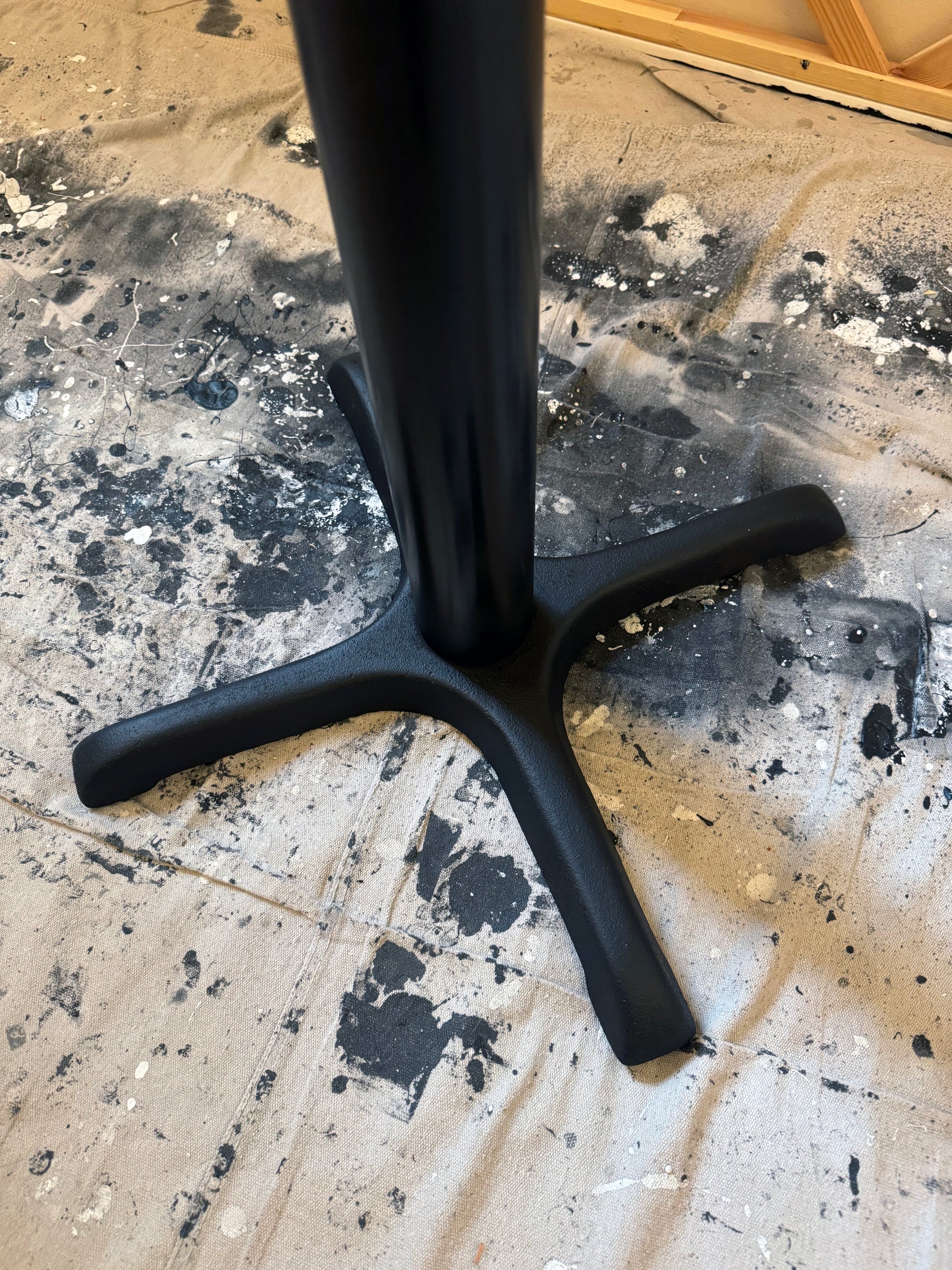 This table and chairs is refurbished from Thirteenth Floor's Speakeasy (cocktail lounge) that once accompanied our gallery back during our roots in the Canton Arts District. This table and chairs is fully functional, has been heavily clear-coated and can be cleaned with soap and water (or regular cleaning products).