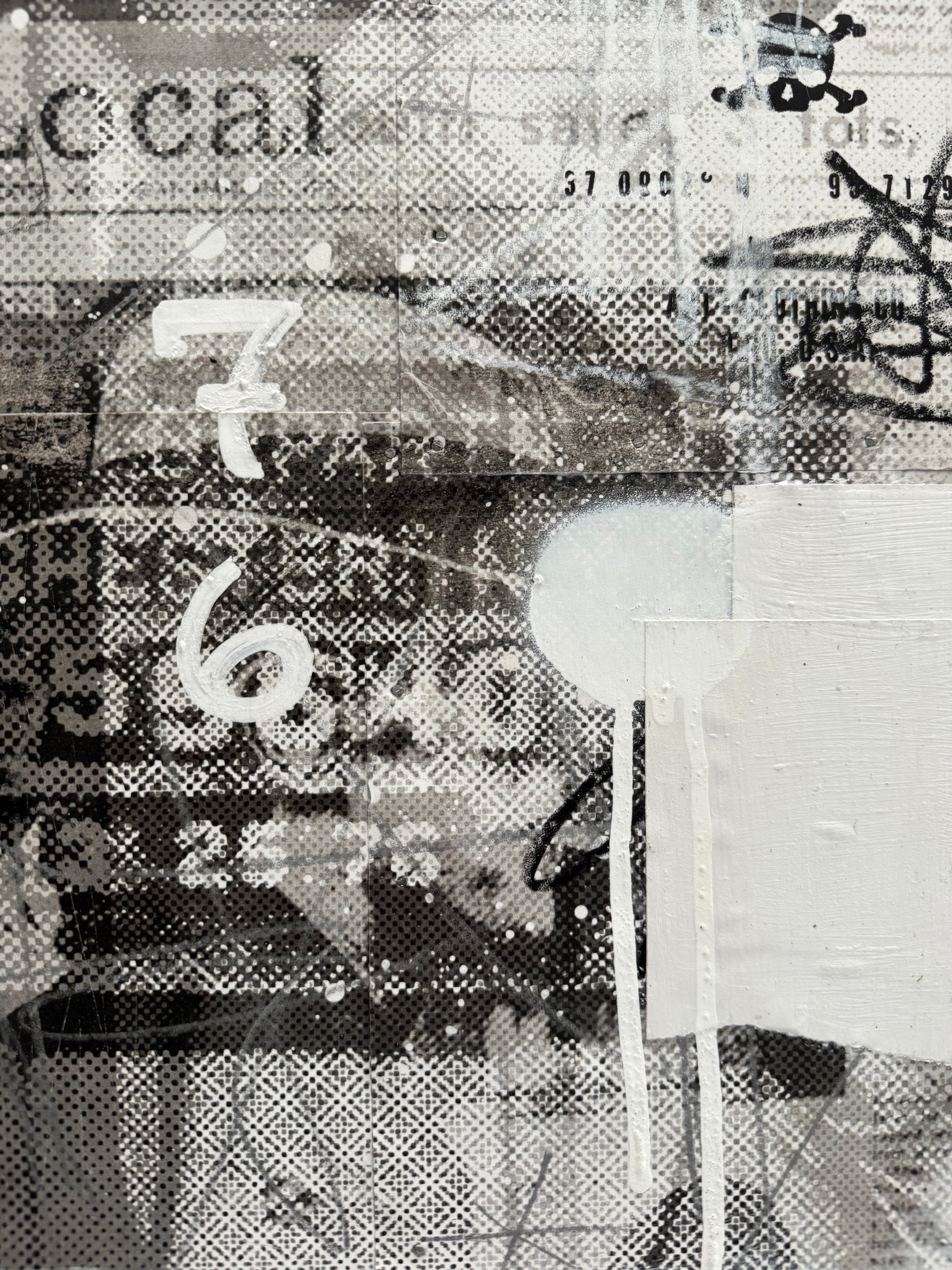 The 1976 mugshot of David Bowie echoes one of the first images the artist used when beginning mixed media work in 2018, revisited here on a surface that predates that shift and bridges those two periods of work.