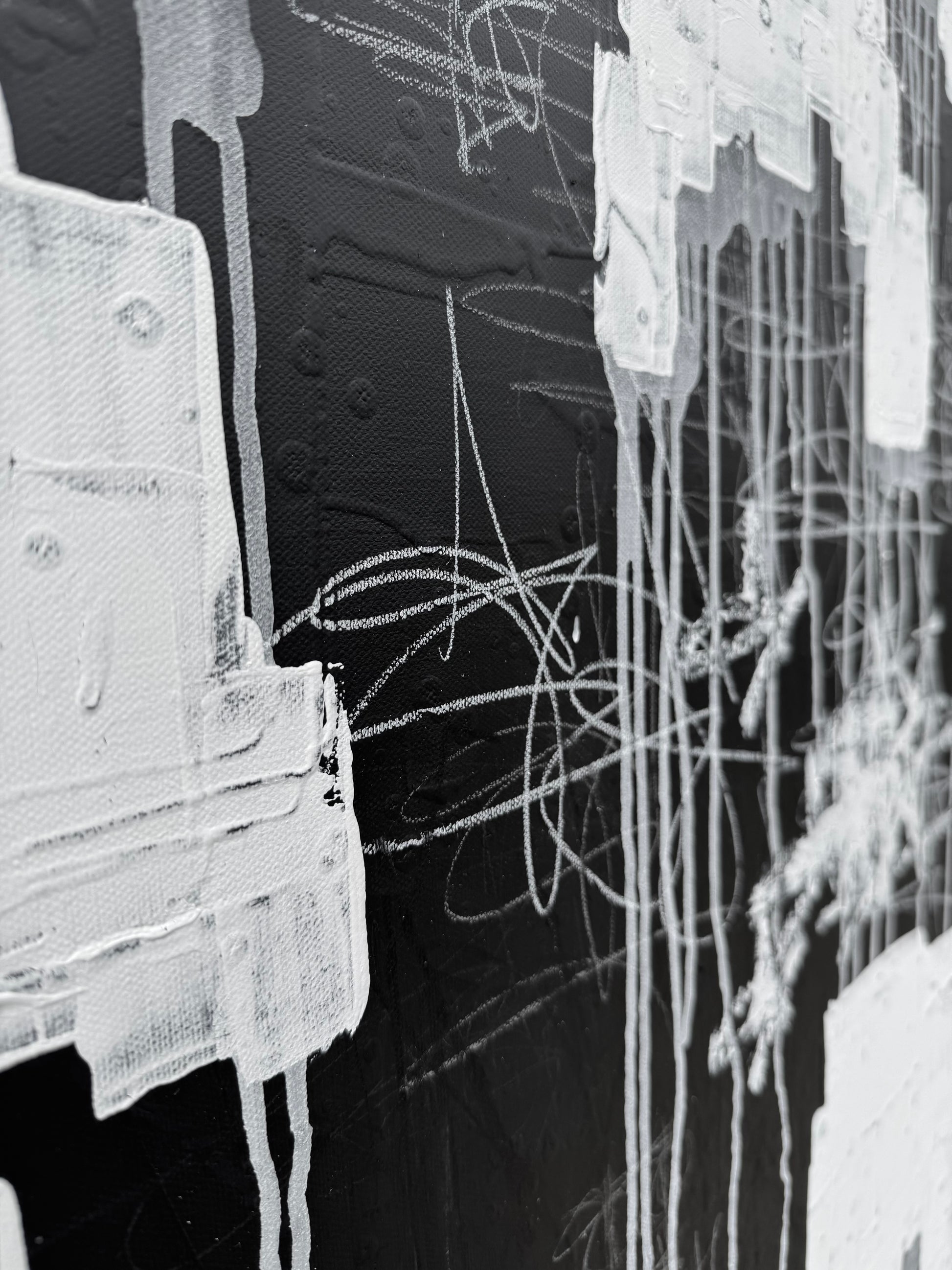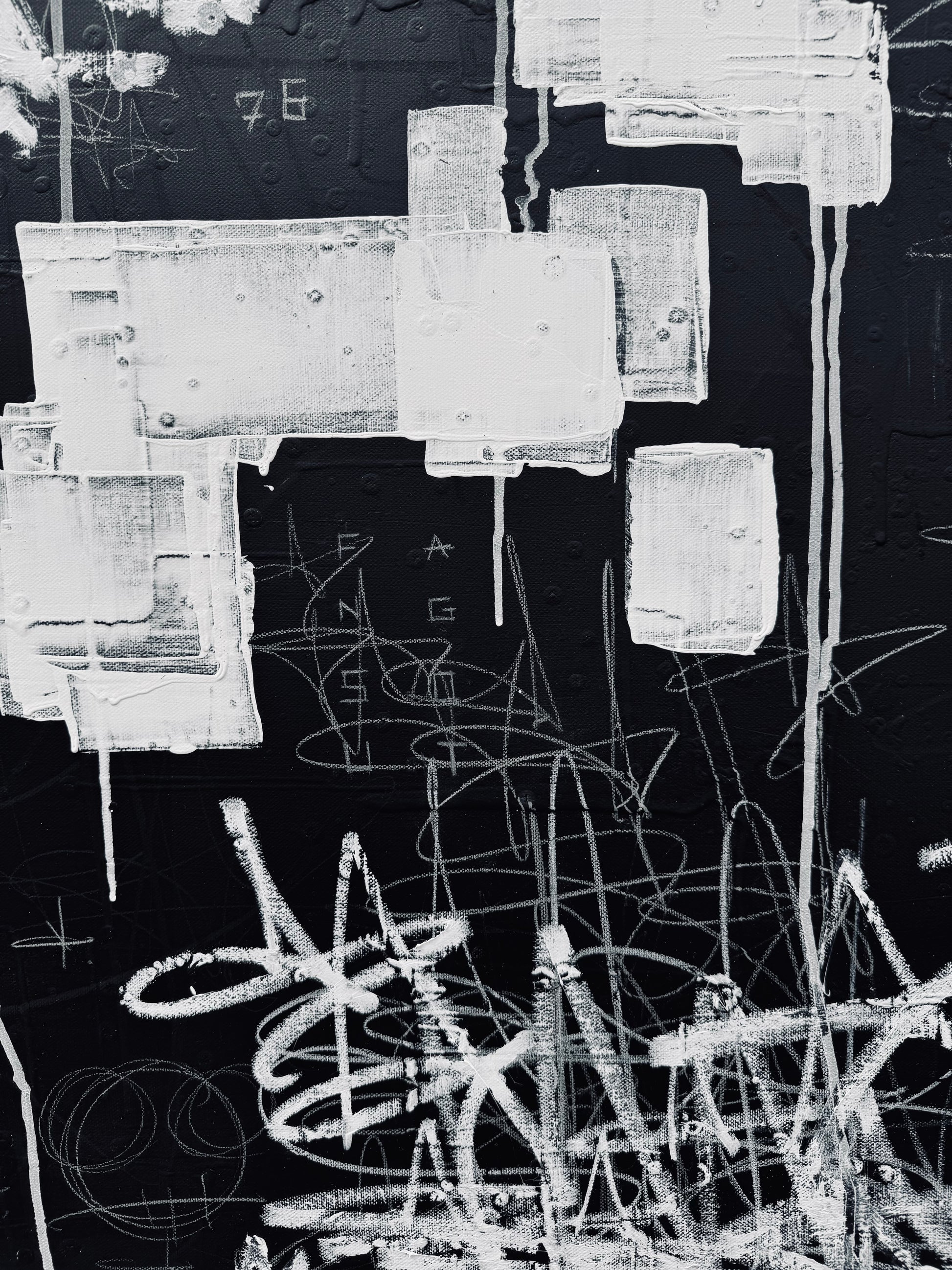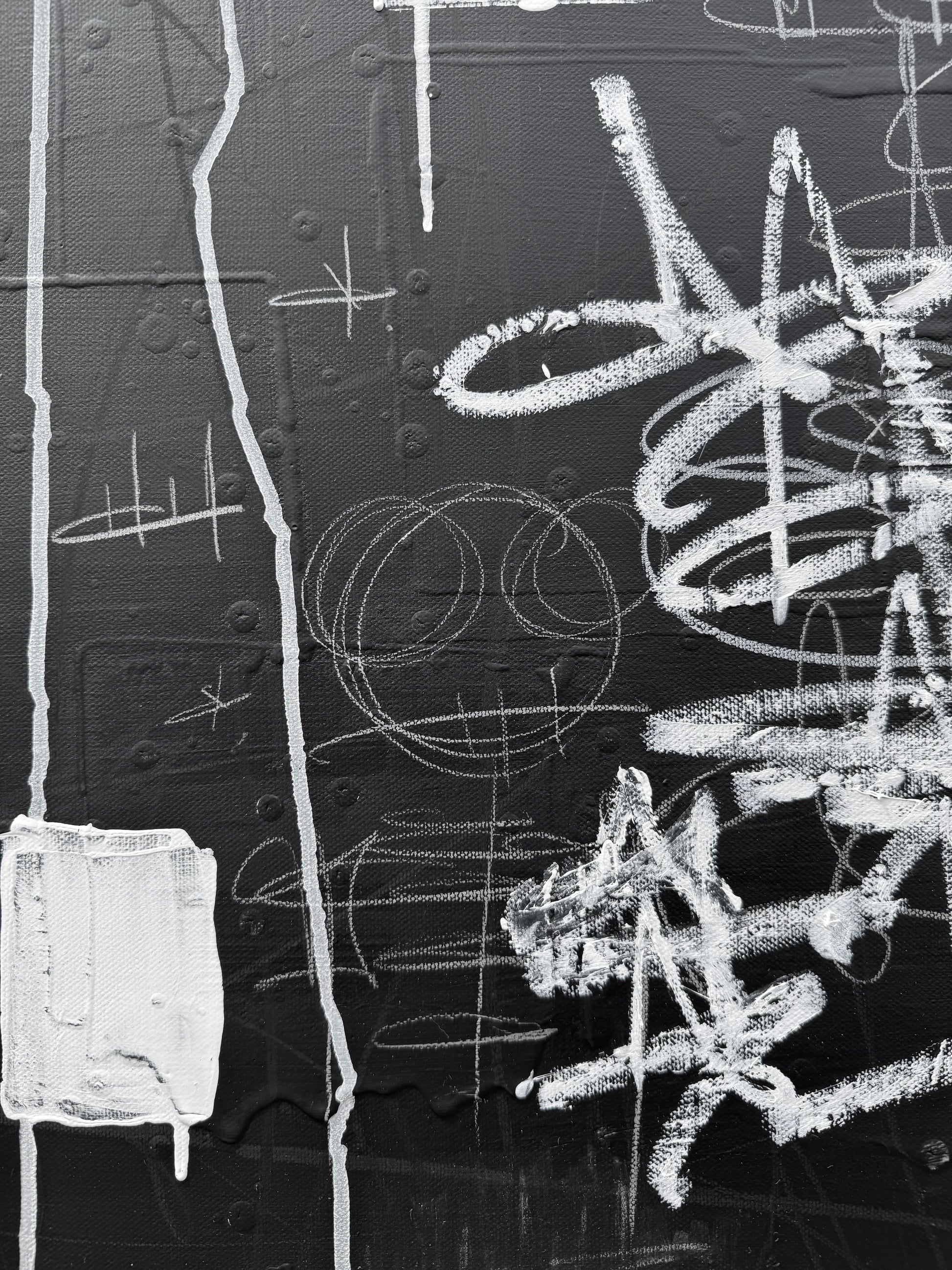 This dynamic mixed media painting is an expressive blend of paint, pencil, colored pencil, grease marker, oil stick, house paint, and chalkboard paint on canvas. Bold, graffiti-inspired gestures and spontaneous marks create powerful visual energy, while handwritten fragments and dripped textures infuse the piece with authenticity and raw emotion. With a striking, monochromatic palette, the artwork bridges contemporary abstraction and urban street aesthetics—ideal for collectors seeking captivating, investment-quality contemporary art.