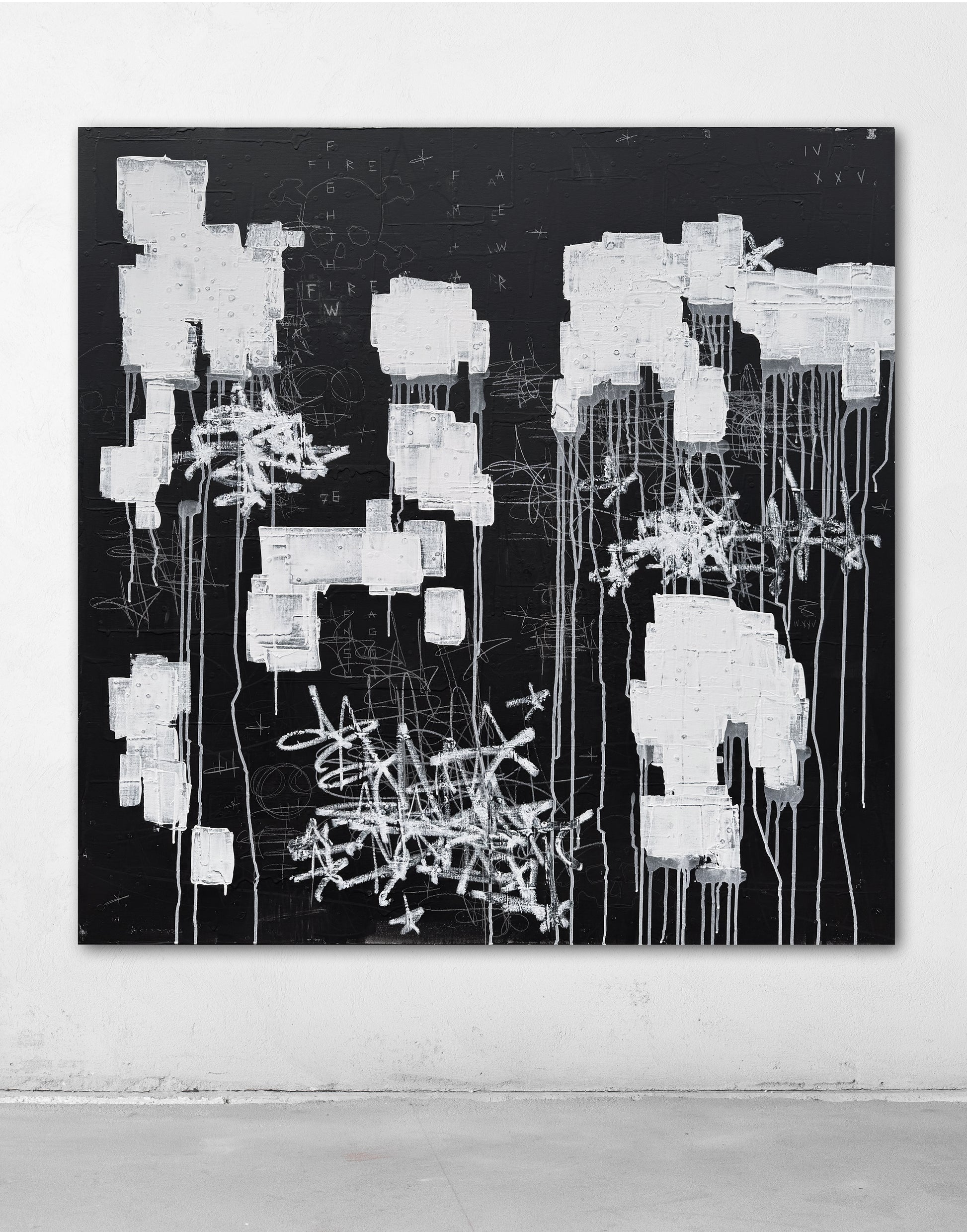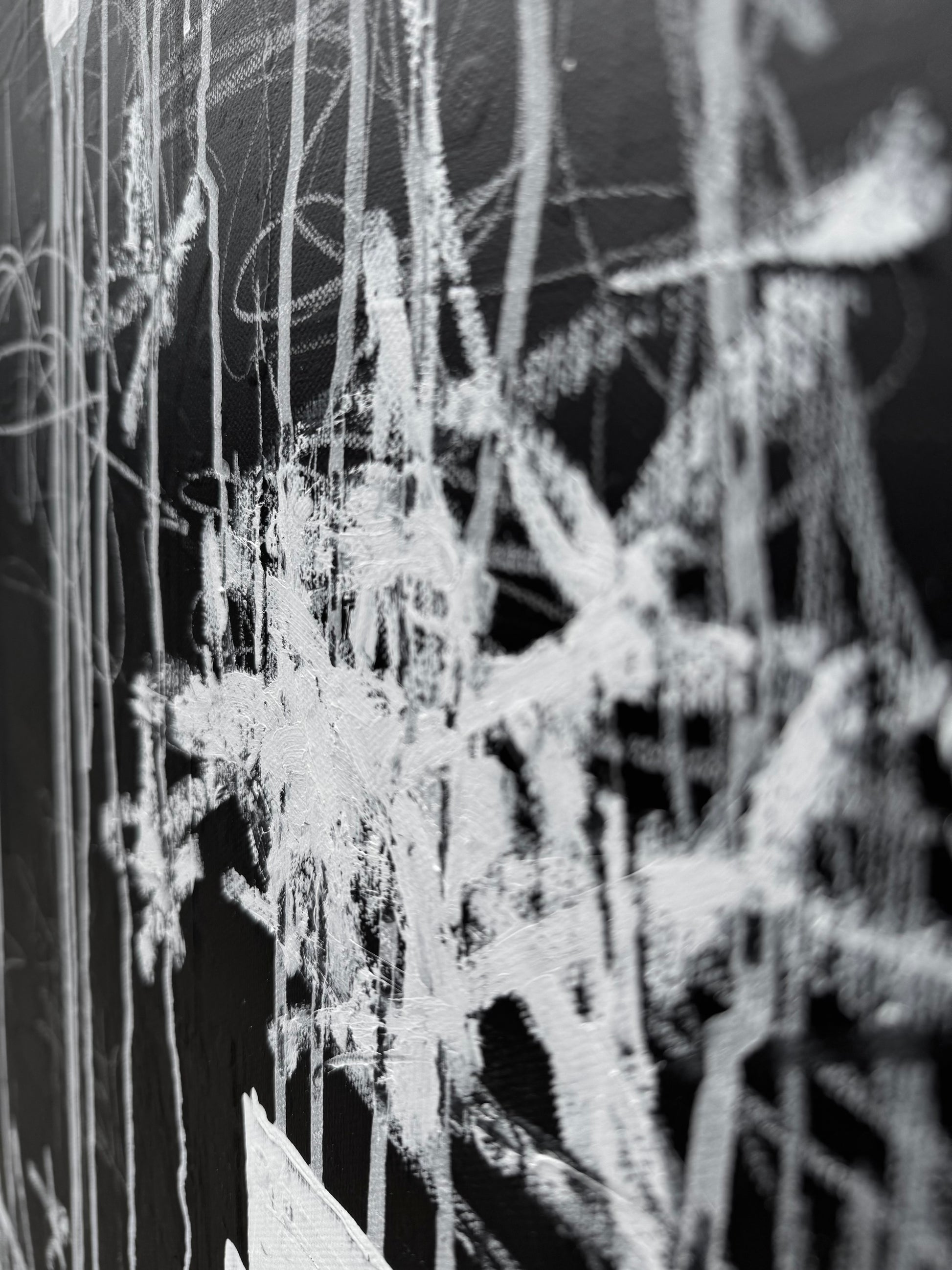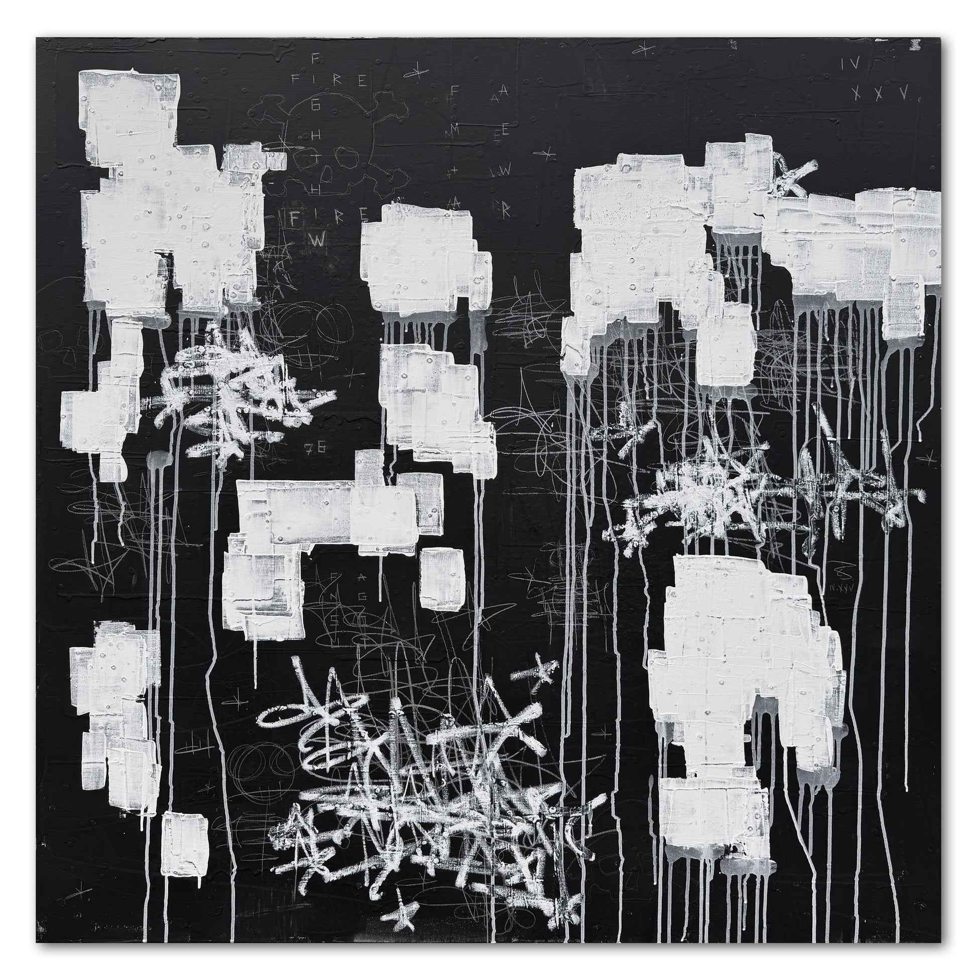 This dynamic mixed media painting is an expressive blend of paint, pencil, colored pencil, grease marker, oil stick, house paint, and chalkboard paint on canvas. Bold, graffiti-inspired gestures and spontaneous marks create powerful visual energy, while handwritten fragments and dripped textures infuse the piece with authenticity and raw emotion. With a striking, monochromatic palette, the artwork bridges contemporary abstraction and urban street aesthetics—ideal for collectors seeking captivating, investment-quality contemporary art.