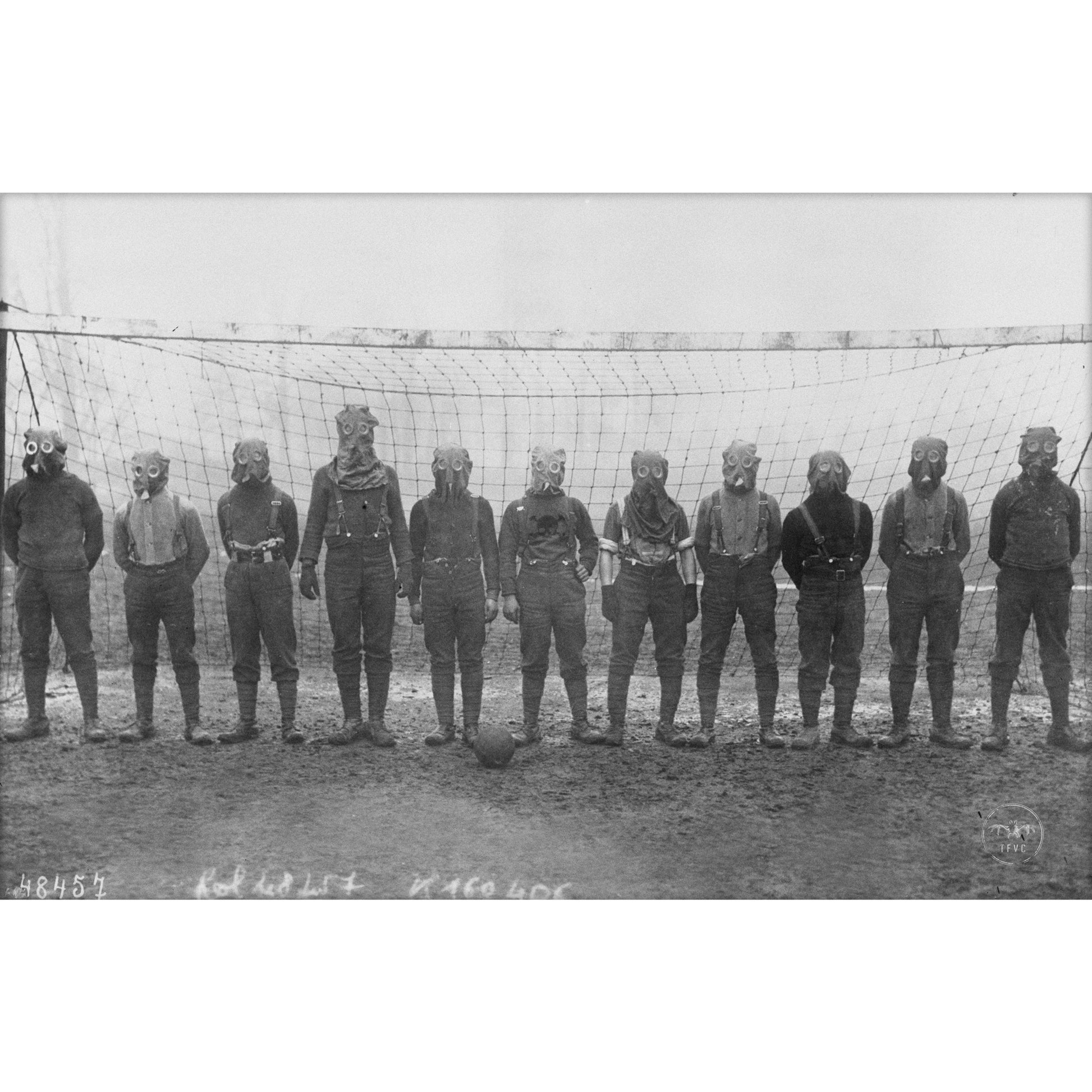 Soccer team of British soldiers with gas masks, World War I, somewhere in Northern France, 1916. Press photo.